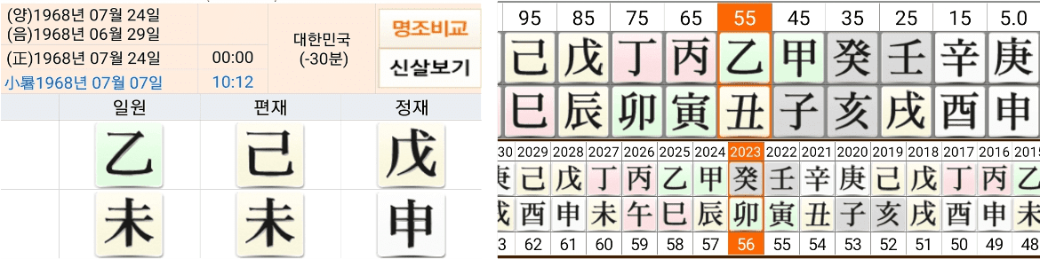 23년이 최고다. 사주로 보면 23년에 오는 운이 과거 탁재훈이 30대 때 좋은 운을 맞이한 것과 비슷하게 보인다. 사주 구조가 뜨거울 때 태어나서 무언가를 발전시키고 열매를 맺어서 실질적 성과를 내야 하는데 태어난 날이 을목의 새싹으로 열매가 되기까지는 많은 시간이 필요하다. 사주의 조후(뜨겁고, 차갑고)의 균형이 잘 맞지 않고 대운에서도 이제는 균형을 맞추기가 힘들다. 하지만 사주는 언제나 양날의 검이다. 반대로 생각하면 대운에서 불의 에너지가 더 들어오면 사주원국이 가지고 있는 태성적 재능(재치, 입담)이 더 커진다. 즉, 탁재훈은 사업, 건물, 부동산 등 현실과 직접적인 투자를 하면 손실이 반드시 있고 반대로 방송 출연을 통해 그의 재능을 보여 준다면 오랫동안 그 인기를 유지할 수 있을 것이다.