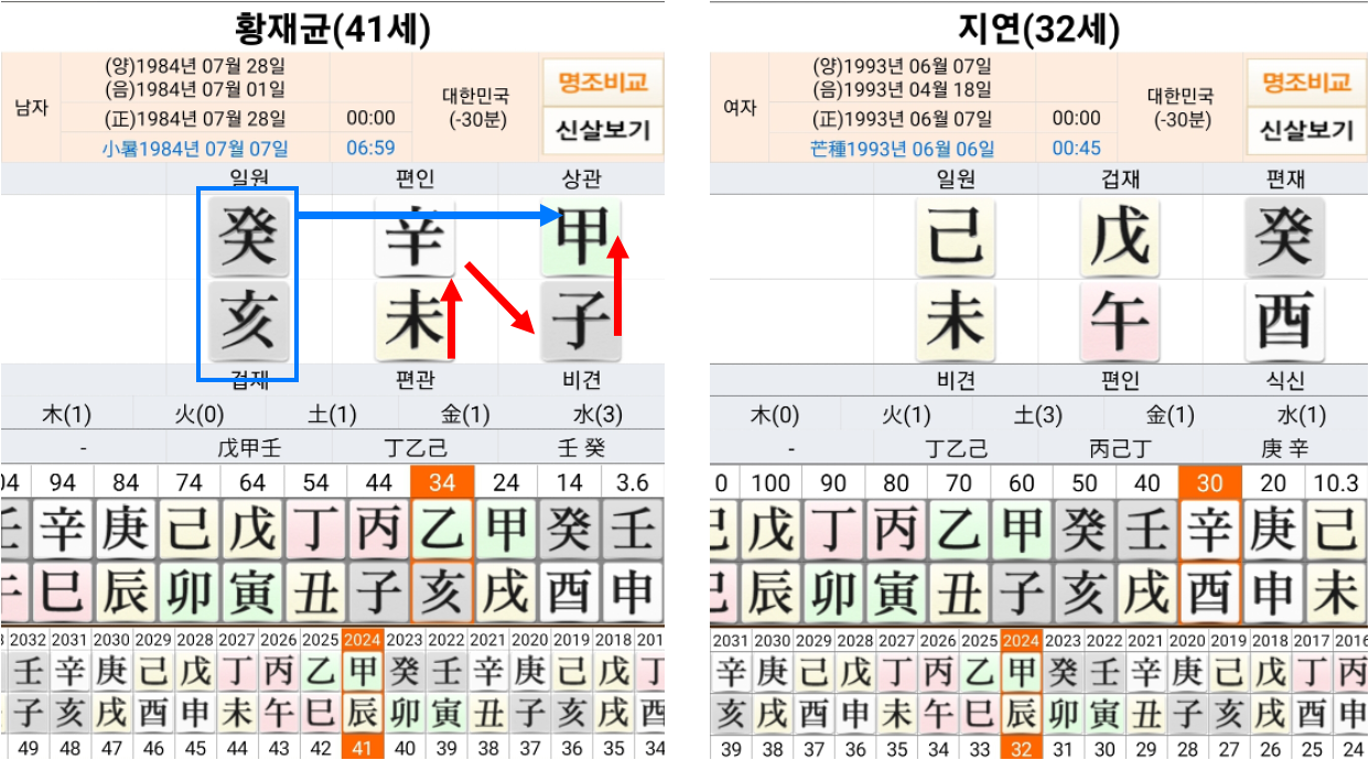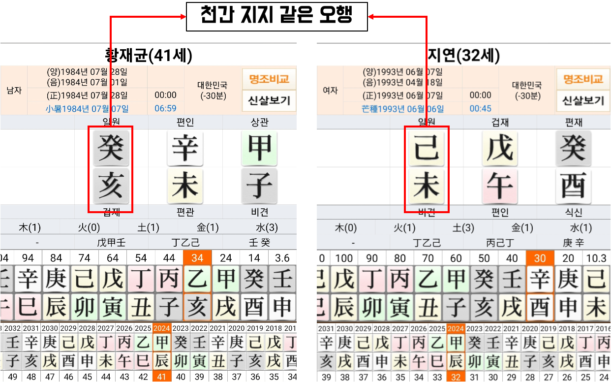 꼭 이런 사주는 비슷한 사주를 만난다. 티아라 지연사를 보아도 마찬가지로 일주가 같은 오행이다.